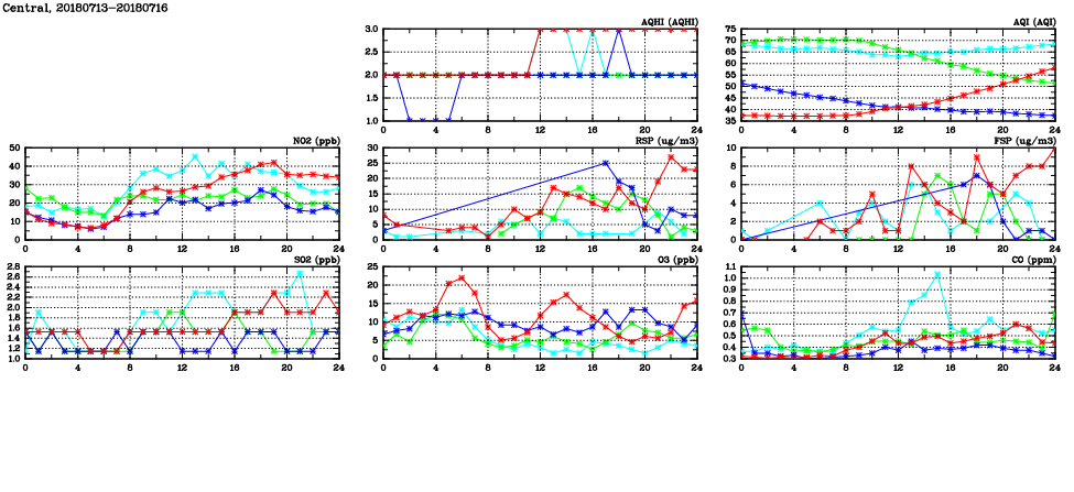 | Air Quality Data Time Series in Central (2018/07/16) | ( Line colors: Day -3 Day -2 Day -1 Current day ) | 2D Map Current AQHI |