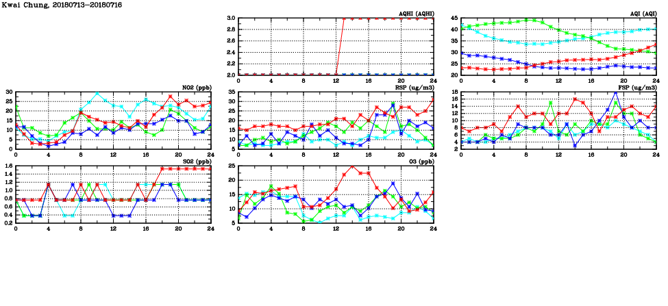 | Air Quality Data Time Series in Kwai Chung (2018/07/16) | ( Line colors: Day -3 Day -2 Day -1 Current day ) | 2D Map Current AQHI |