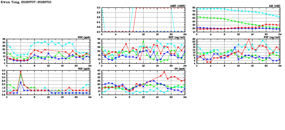 | Air Quality Data Time Series in Kwun Tong (2018/07/10) | ( Line colors: Day -3 Day -2 Day -1 Current day ) | 2D Map Current AQHI |