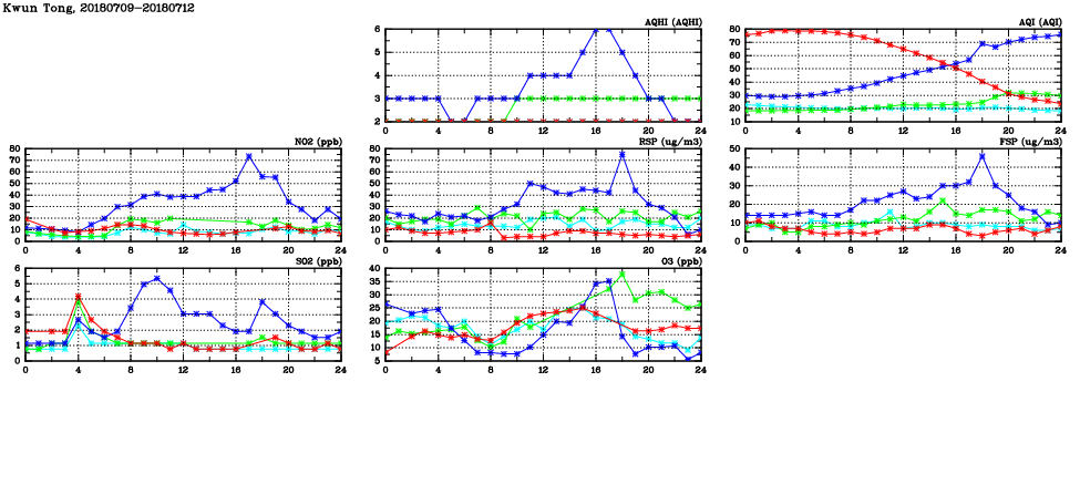 | Air Quality Data Time Series in Kwun Tong (2018/07/12) | ( Line colors: Day -3 Day -2 Day -1 Current day ) | 2D Map Current AQHI |