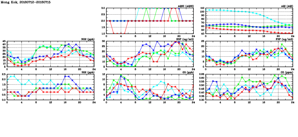 | Air Quality Data Time Series in Mong Kok (2018/07/15) | ( Line colors: Day -3 Day -2 Day -1 Current day ) | 2D Map Current AQHI |