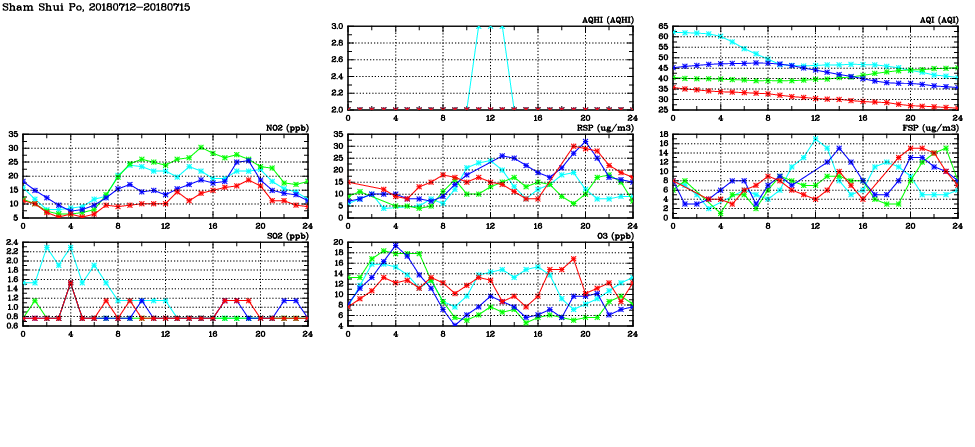 | Air Quality Data Time Series in Sham Shui Po (2018/07/15) | ( Line colors: Day -3 Day -2 Day -1 Current day ) | 2D Map Current AQHI |