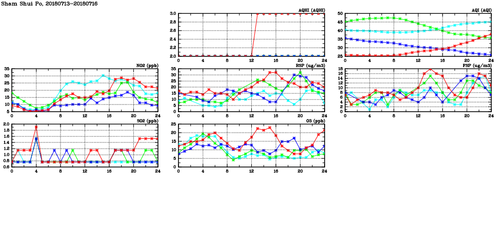 | Air Quality Data Time Series in Sham Shui Po (2018/07/16) | ( Line colors: Day -3 Day -2 Day -1 Current day ) | 2D Map Current AQHI |