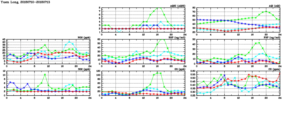 | Air Quality Data Time Series in Yuen Long (2018/07/13) | ( Line colors: Day -3 Day -2 Day -1 Current day ) | 2D Map Current AQHI |