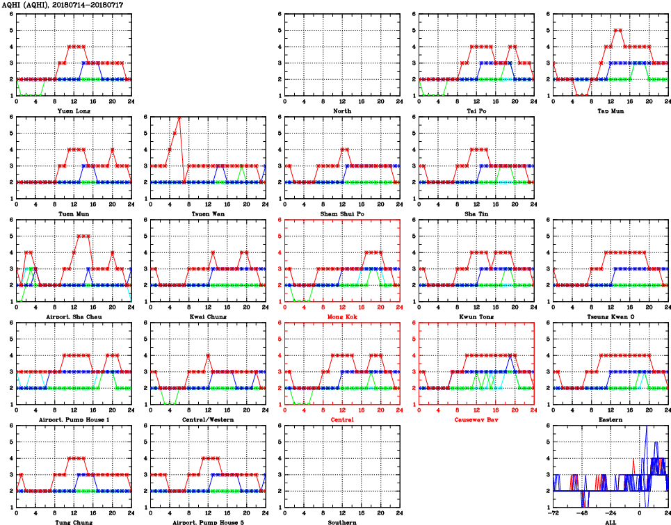 | Air Quality Data Time Series for AQHI (2018/07/17) | ( Line colors: Day -3 Day -2 Day -1 Current day ) | 2D Map Current AQHI |