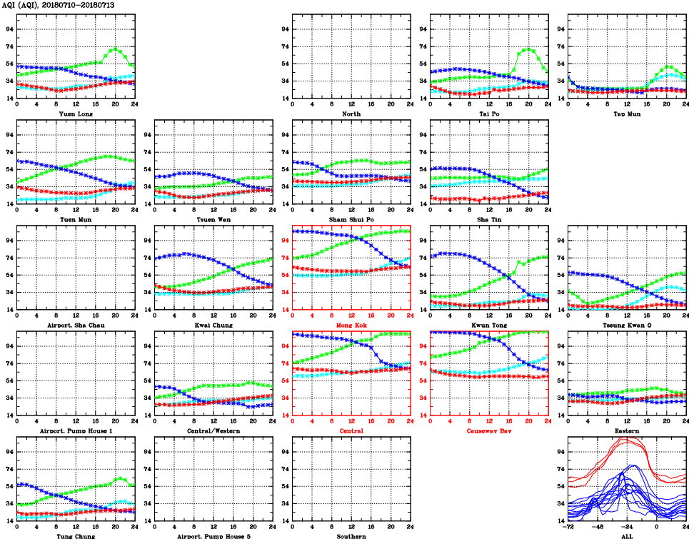 | Air Quality Data Time Series for AQI (2018/07/13) | ( Line colors: Day -3 Day -2 Day -1 Current day ) | 2D Map Current AQHI |