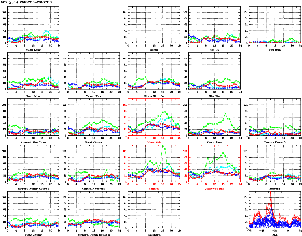 | Air Quality Data Time Series for NO2 (2018/07/13) | ( Line colors: Day -3 Day -2 Day -1 Current day ) | 2D Map Current AQHI |