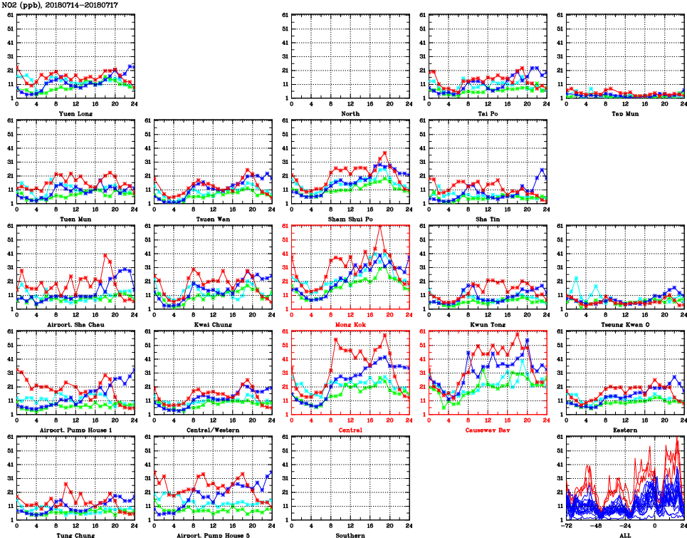 | Air Quality Data Time Series for NO2 (2018/07/17) | ( Line colors: Day -3 Day -2 Day -1 Current day ) | 2D Map Current AQHI |