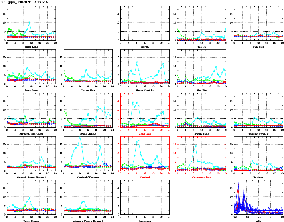 | Air Quality Data Time Series for SO2 (2018/07/14) | ( Line colors: Day -3 Day -2 Day -1 Current day ) | 2D Map Current AQHI |