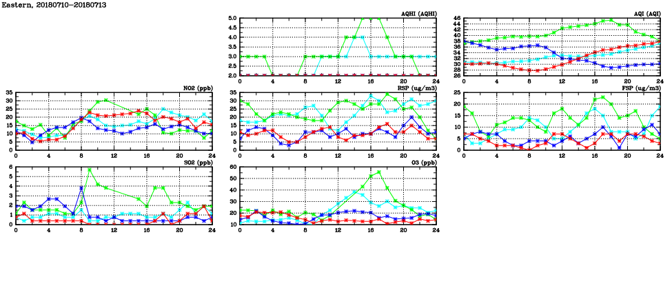| Air Quality Data Time Series in Eastern (2018/07/13) | ( Line colors: Day -3 Day -2 Day -1 Current day ) | 2D Map Current AQHI |