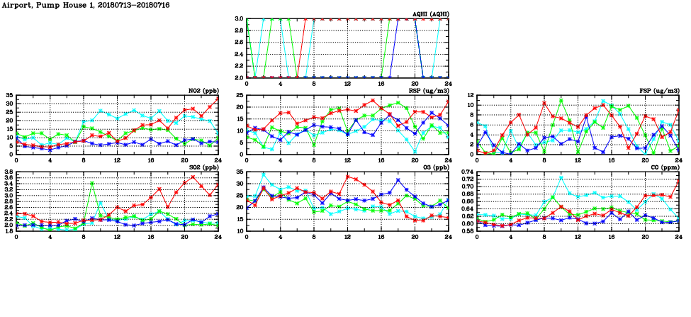 | Air Quality Data Time Series in Airport, Pump House 1 (2018/07/16) | ( Line colors: Day -3 Day -2 Day -1 Current day ) | 2D Map Current AQHI |