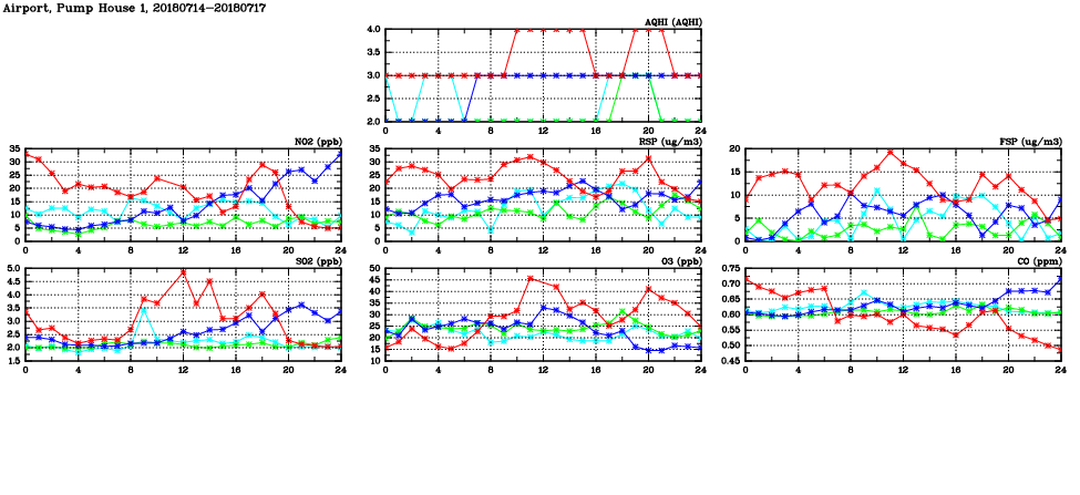 | Air Quality Data Time Series in Airport, Pump House 1 (2018/07/17) | ( Line colors: Day -3 Day -2 Day -1 Current day ) | 2D Map Current AQHI |