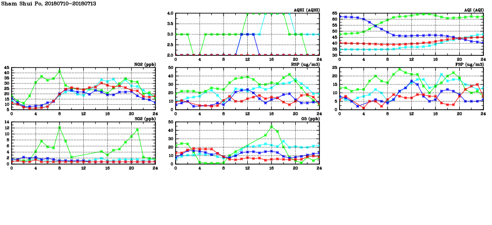 | Air Quality Data Time Series in Sham Shui Po (2018/07/13) | ( Line colors: Day -3 Day -2 Day -1 Current day ) | 2D Map Current AQHI |