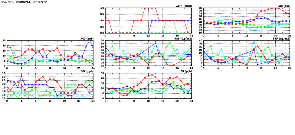 | Air Quality Data Time Series in Sha Tin (2018/07/17) | ( Line colors: Day -3 Day -2 Day -1 Current day ) | 2D Map Current AQHI |