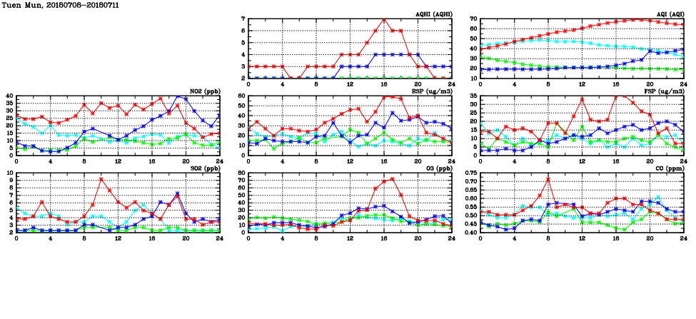 | Air Quality Data Time Series in Tuen Mun (2018/07/11) | ( Line colors: Day -3 Day -2 Day -1 Current day ) | 2D Map Current AQHI |