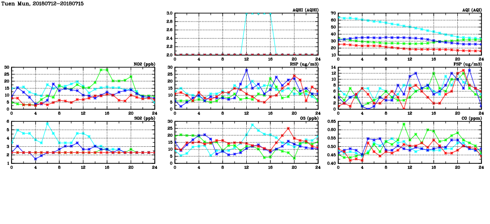 | Air Quality Data Time Series in Tuen Mun (2018/07/15) | ( Line colors: Day -3 Day -2 Day -1 Current day ) | 2D Map Current AQHI |