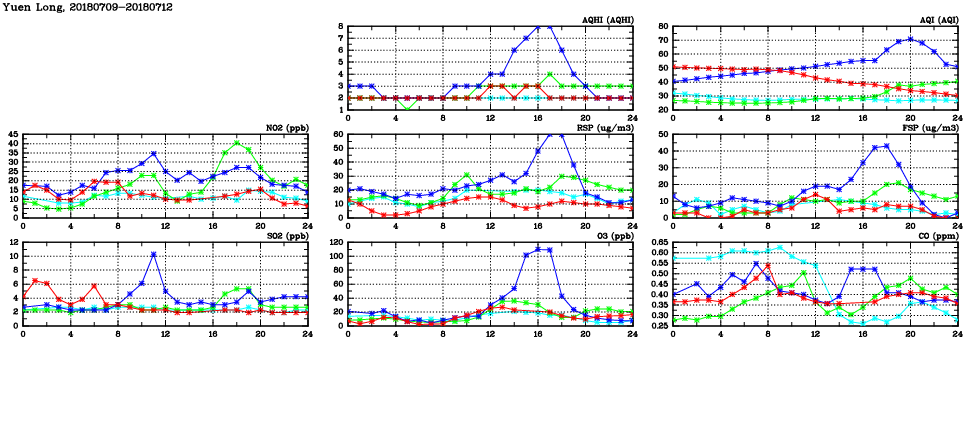| Air Quality Data Time Series in Yuen Long (2018/07/12) | ( Line colors: Day -3 Day -2 Day -1 Current day ) | 2D Map Current AQHI |