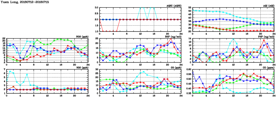 | Air Quality Data Time Series in Yuen Long (2018/07/15) | ( Line colors: Day -3 Day -2 Day -1 Current day ) | 2D Map Current AQHI |