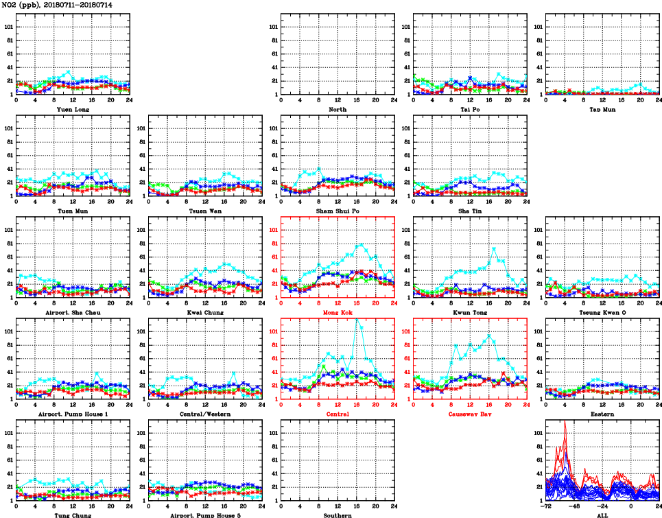 | Air Quality Data Time Series for NO2 (2018/07/14) | ( Line colors: Day -3 Day -2 Day -1 Current day ) | 2D Map Current AQHI |