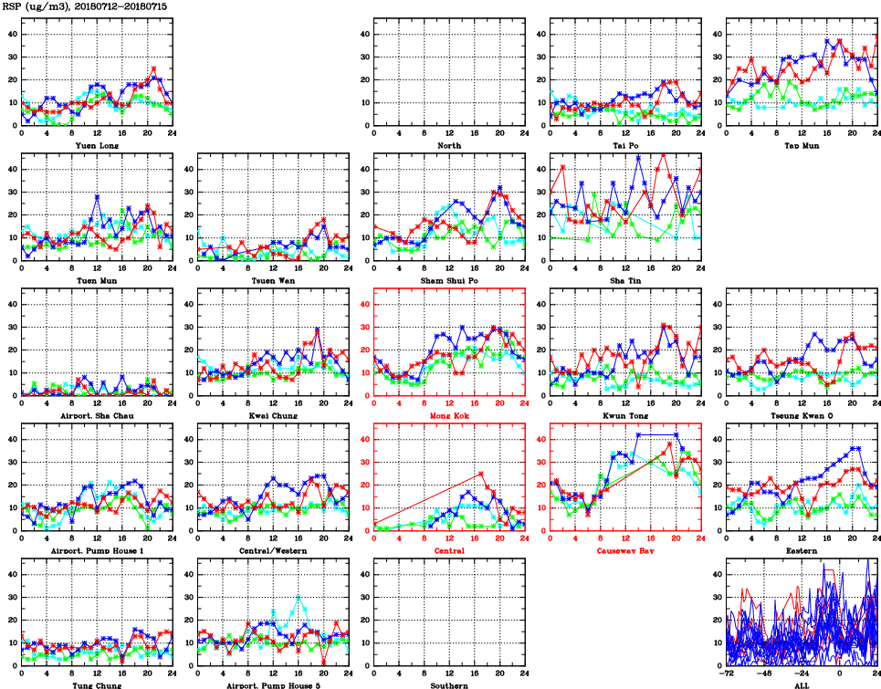 | Air Quality Data Time Series for RSP (2018/07/15) | ( Line colors: Day -3 Day -2 Day -1 Current day ) | 2D Map Current AQHI |