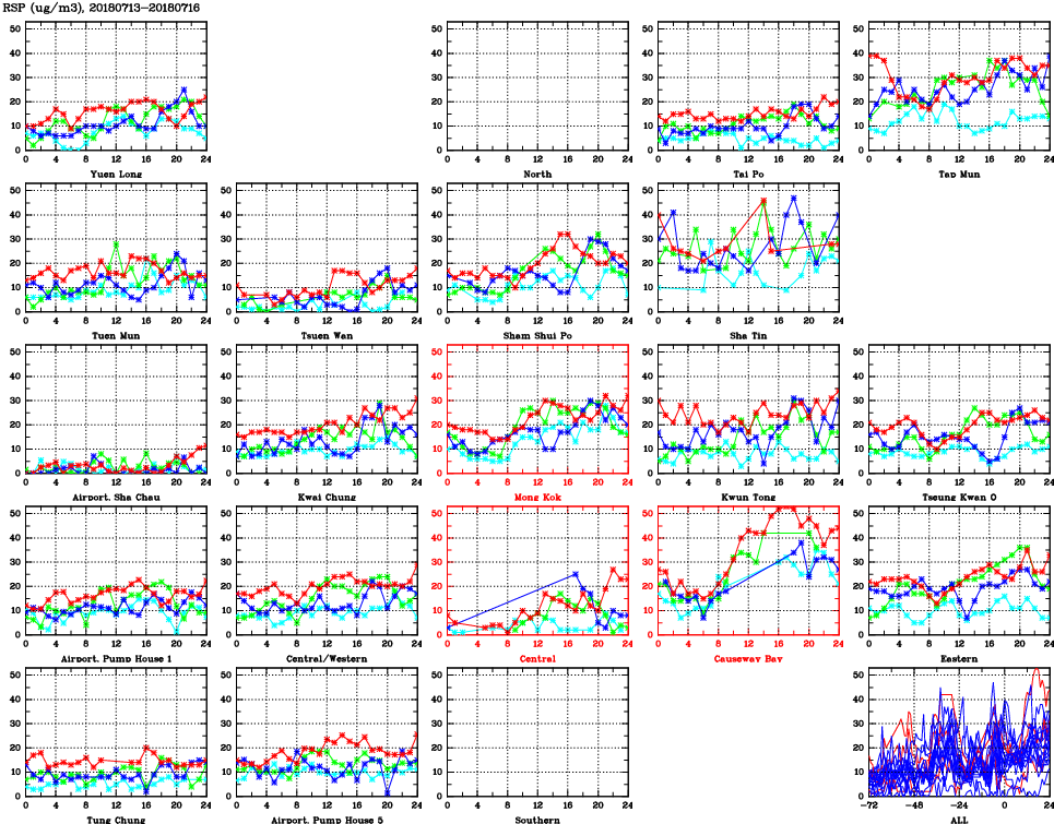 | Air Quality Data Time Series for RSP (2018/07/16) | ( Line colors: Day -3 Day -2 Day -1 Current day ) | 2D Map Current AQHI |