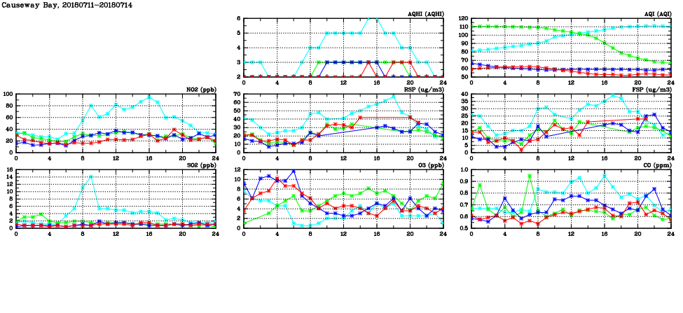| Air Quality Data Time Series in Causeway Bay (2018/07/14) | ( Line colors: Day -3 Day -2 Day -1 Current day ) | 2D Map Current AQHI |