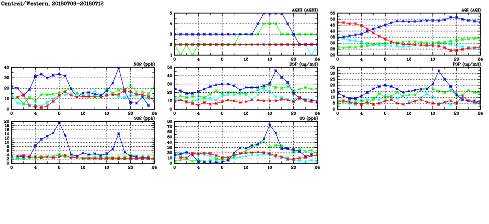 | Air Quality Data Time Series in Central/Western (2018/07/12) | ( Line colors: Day -3 Day -2 Day -1 Current day ) | 2D Map Current AQHI |