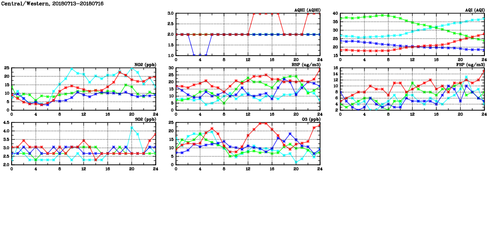 | Air Quality Data Time Series in Central/Western (2018/07/16) | ( Line colors: Day -3 Day -2 Day -1 Current day ) | 2D Map Current AQHI |