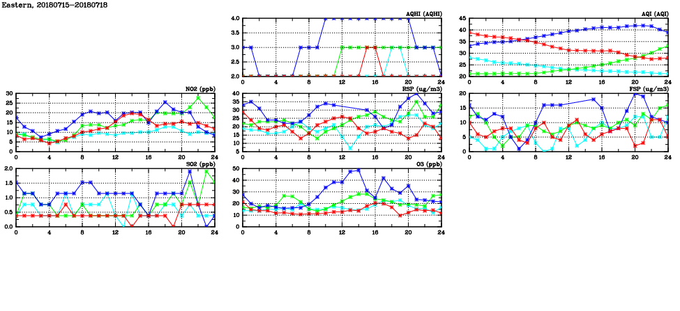 | Air Quality Data Time Series in Eastern (2018/07/18) | ( Line colors: Day -3 Day -2 Day -1 Current day ) | 2D Map Current AQHI |