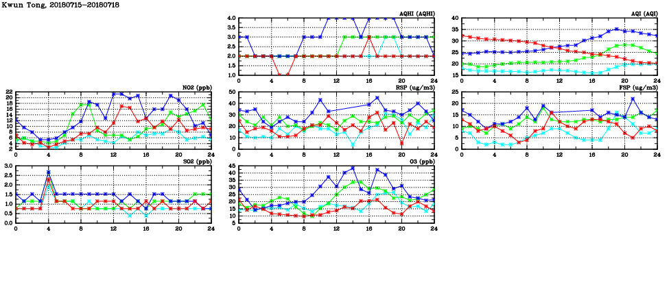| Air Quality Data Time Series in Kwun Tong (2018/07/18) | ( Line colors: Day -3 Day -2 Day -1 Current day ) | 2D Map Current AQHI |