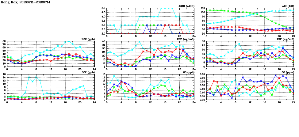| Air Quality Data Time Series in Mong Kok (2018/07/14) | ( Line colors: Day -3 Day -2 Day -1 Current day ) | 2D Map Current AQHI |