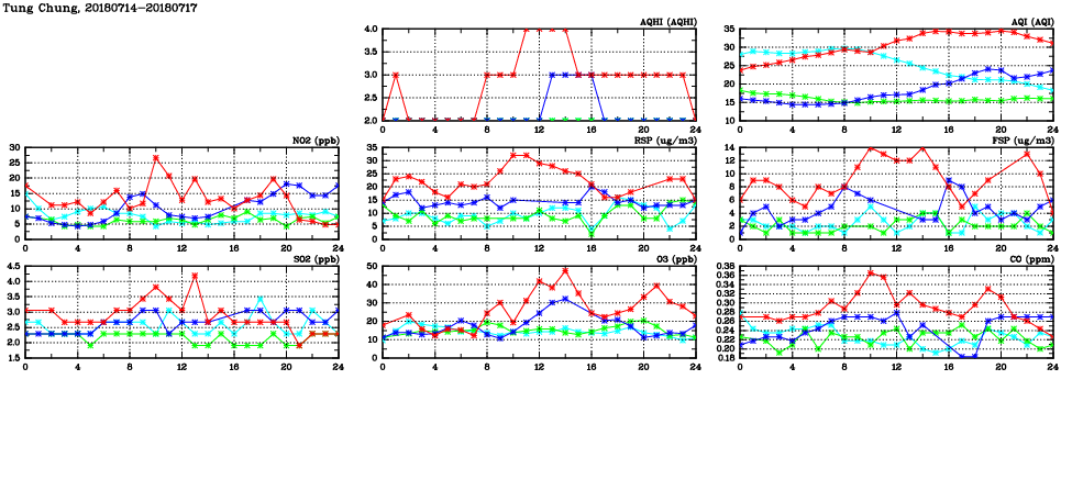 | Air Quality Data Time Series in Tung Chung (2018/07/17) | ( Line colors: Day -3 Day -2 Day -1 Current day ) | 2D Map Current AQHI |