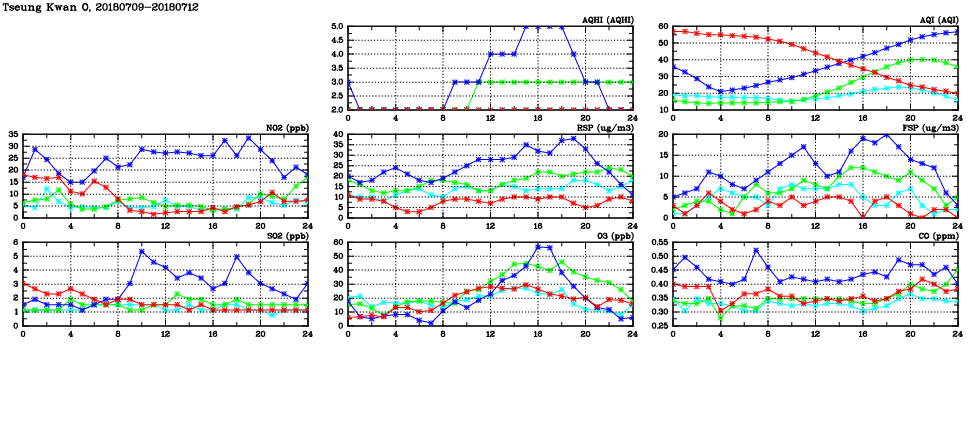 | Air Quality Data Time Series in Tseung Kwan O (2018/07/12) | ( Line colors: Day -3 Day -2 Day -1 Current day ) | 2D Map Current AQHI |