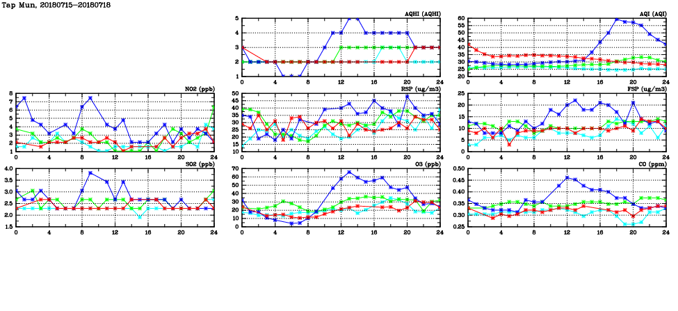 | Air Quality Data Time Series in Tap Mun (2018/07/18) | ( Line colors: Day -3 Day -2 Day -1 Current day ) | 2D Map Current AQHI |