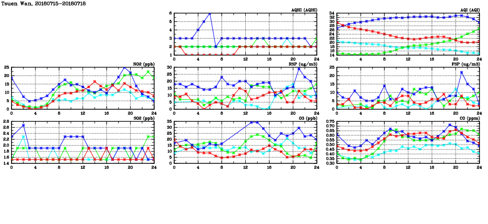 | Air Quality Data Time Series in Tsuen Wan (2018/07/18) | ( Line colors: Day -3 Day -2 Day -1 Current day ) | 2D Map Current AQHI |