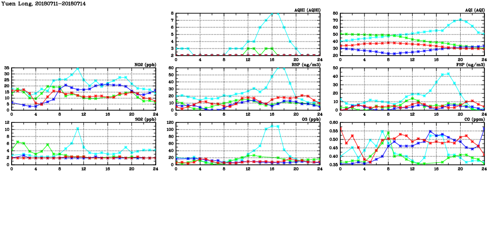 | Air Quality Data Time Series in Yuen Long (2018/07/14) | ( Line colors: Day -3 Day -2 Day -1 Current day ) | 2D Map Current AQHI |