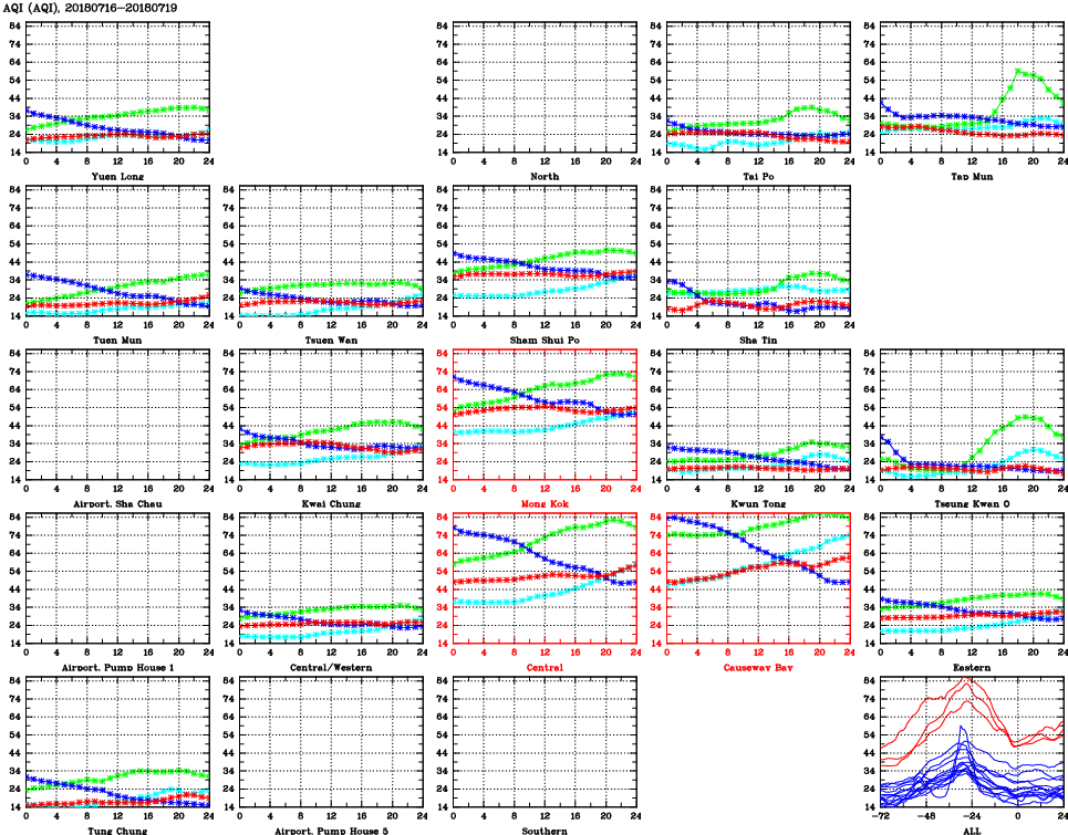 | Air Quality Data Time Series for AQI (2018/07/19) | ( Line colors: Day -3 Day -2 Day -1 Current day ) | 2D Map Current AQHI |