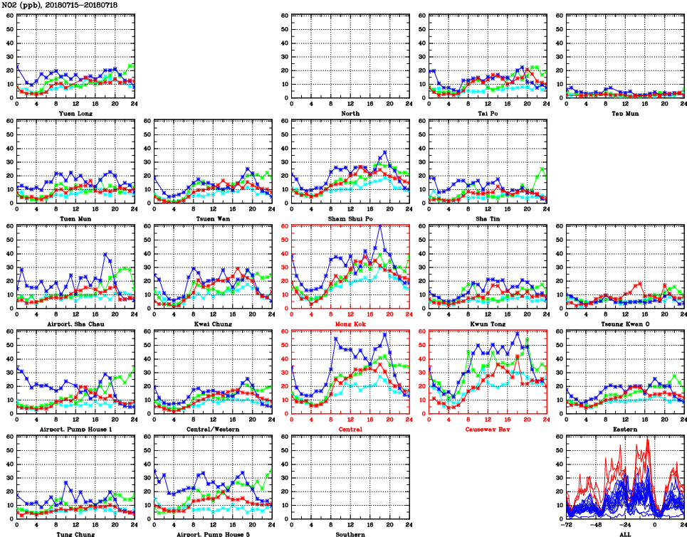 | Air Quality Data Time Series for NO2 (2018/07/18) | ( Line colors: Day -3 Day -2 Day -1 Current day ) | 2D Map Current AQHI |