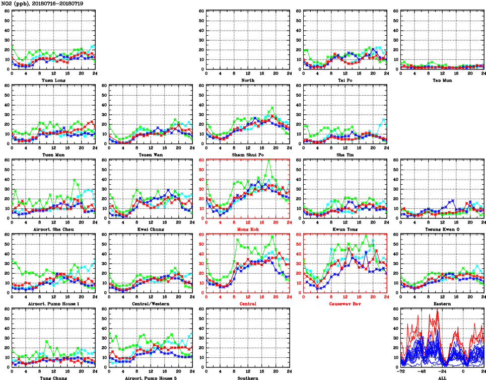 | Air Quality Data Time Series for NO2 (2018/07/19) | ( Line colors: Day -3 Day -2 Day -1 Current day ) | 2D Map Current AQHI |