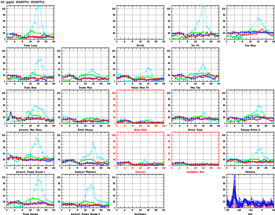 | Air Quality Data Time Series for O3 (2018/07/14) | ( Line colors: Day -3 Day -2 Day -1 Current day ) | 2D Map Current AQHI |