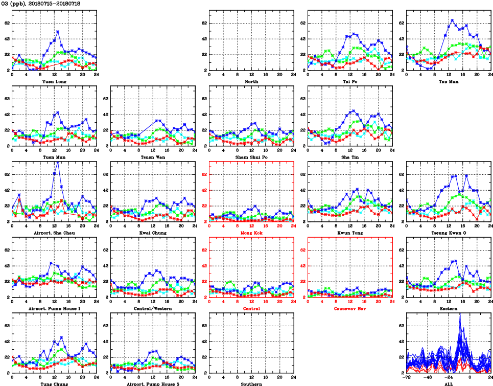 | Air Quality Data Time Series for O3 (2018/07/18) | ( Line colors: Day -3 Day -2 Day -1 Current day ) | 2D Map Current AQHI |