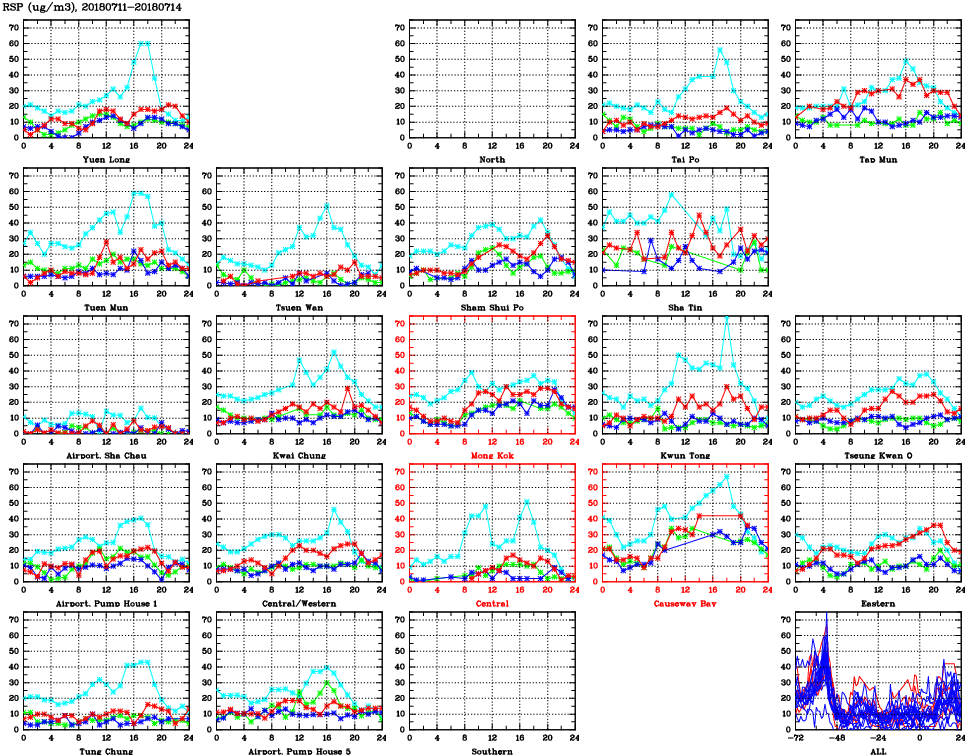 | Air Quality Data Time Series for RSP (2018/07/14) | ( Line colors: Day -3 Day -2 Day -1 Current day ) | 2D Map Current AQHI |