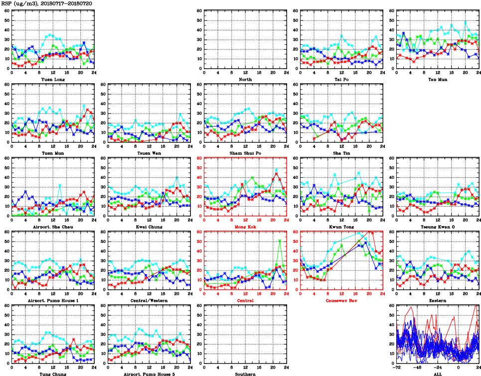 | Air Quality Data Time Series for RSP (2018/07/20) | ( Line colors: Day -3 Day -2 Day -1 Current day ) | 2D Map Current AQHI |
