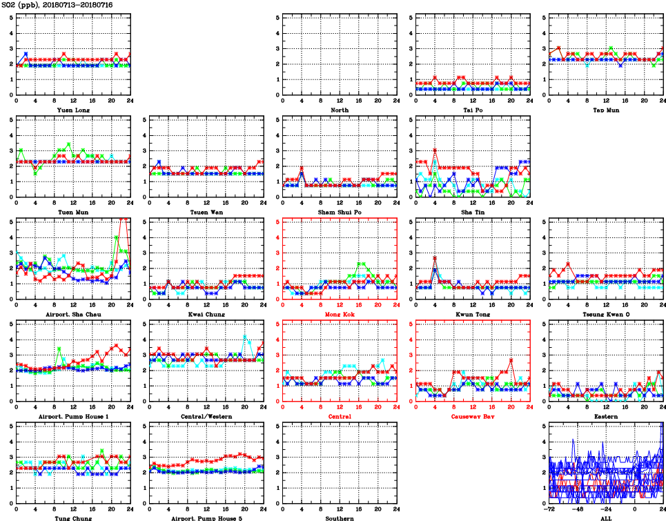 | Air Quality Data Time Series for SO2 (2018/07/16) | ( Line colors: Day -3 Day -2 Day -1 Current day ) | 2D Map Current AQHI |