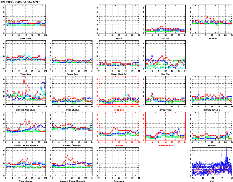 | Air Quality Data Time Series for SO2 (2018/07/17) | ( Line colors: Day -3 Day -2 Day -1 Current day ) | 2D Map Current AQHI |