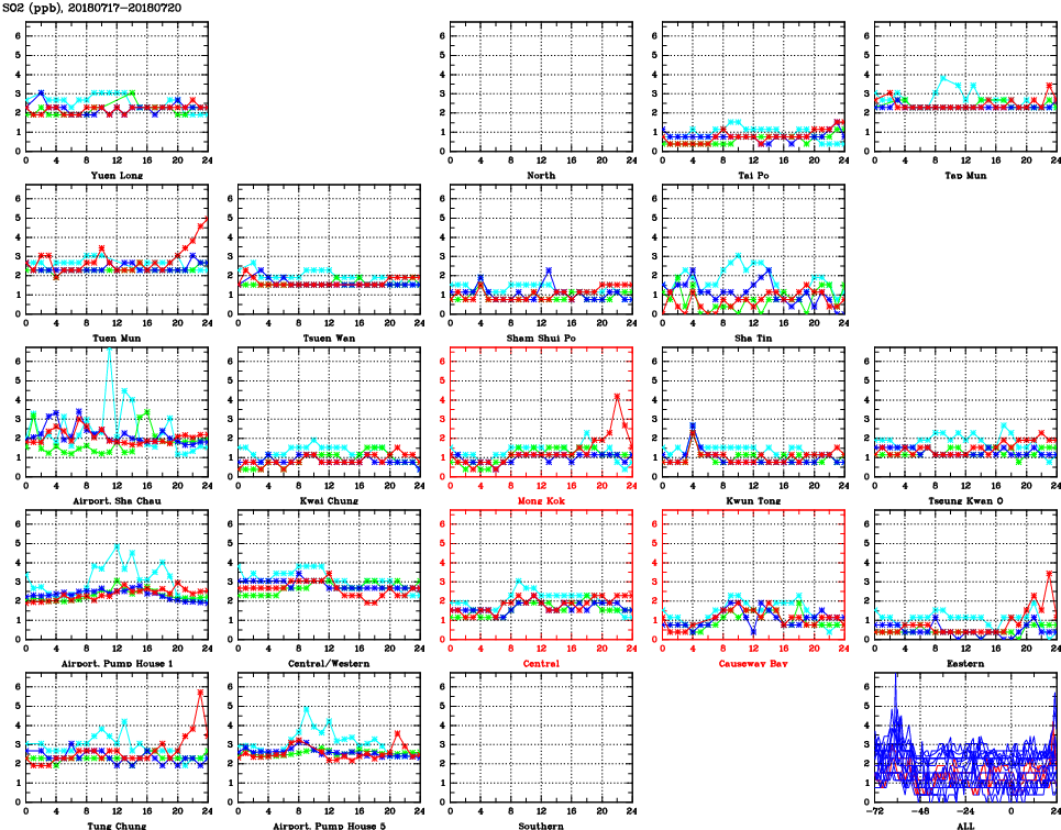 | Air Quality Data Time Series for SO2 (2018/07/20) | ( Line colors: Day -3 Day -2 Day -1 Current day ) | 2D Map Current AQHI |
