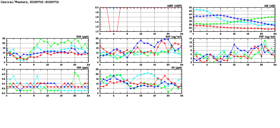 | Air Quality Data Time Series in Central/Western (2018/07/15) | ( Line colors: Day -3 Day -2 Day -1 Current day ) | 2D Map Current AQHI |