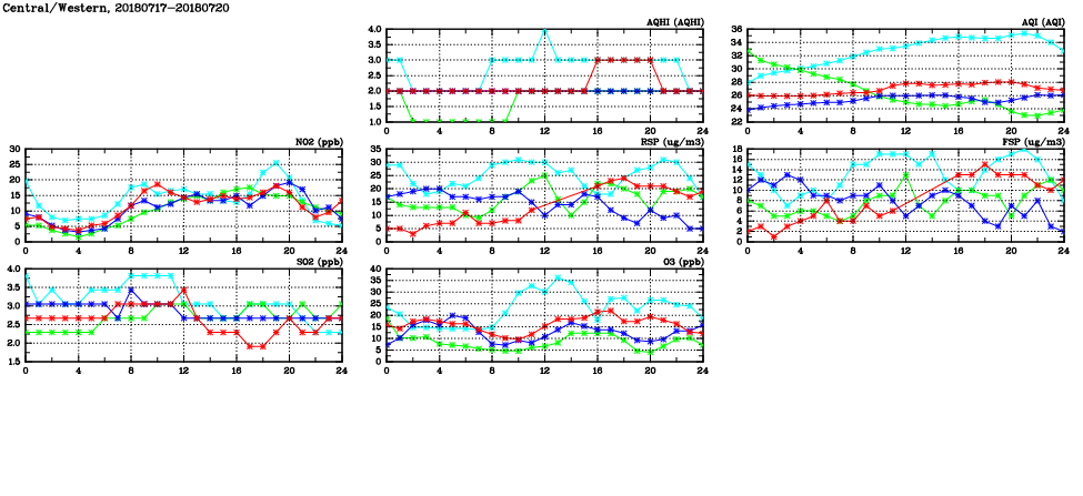 | Air Quality Data Time Series in Central/Western (2018/07/20) | ( Line colors: Day -3 Day -2 Day -1 Current day ) | 2D Map Current AQHI |
