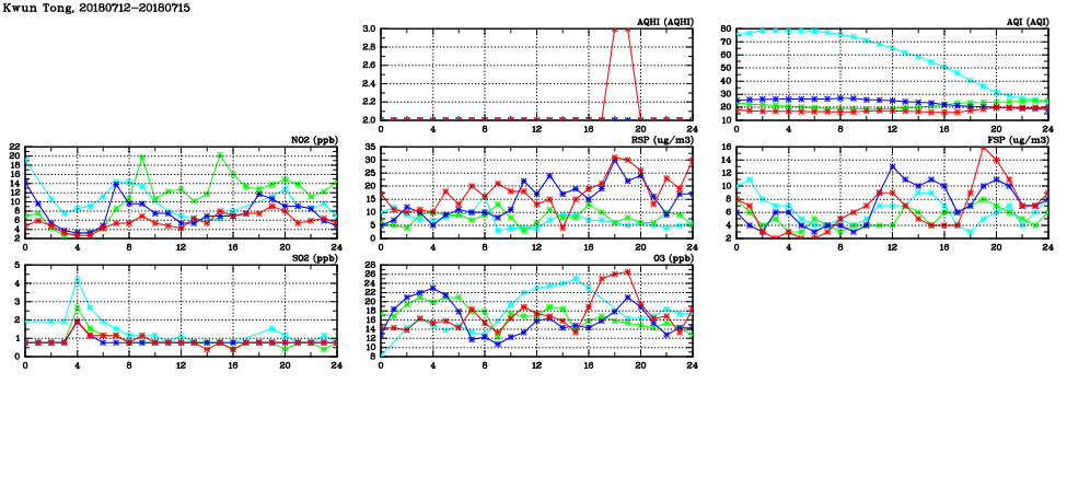 | Air Quality Data Time Series in Kwun Tong (2018/07/15) | ( Line colors: Day -3 Day -2 Day -1 Current day ) | 2D Map Current AQHI |