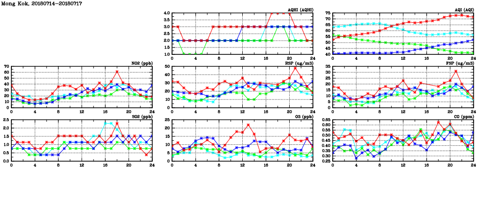 | Air Quality Data Time Series in Mong Kok (2018/07/17) | ( Line colors: Day -3 Day -2 Day -1 Current day ) | 2D Map Current AQHI |